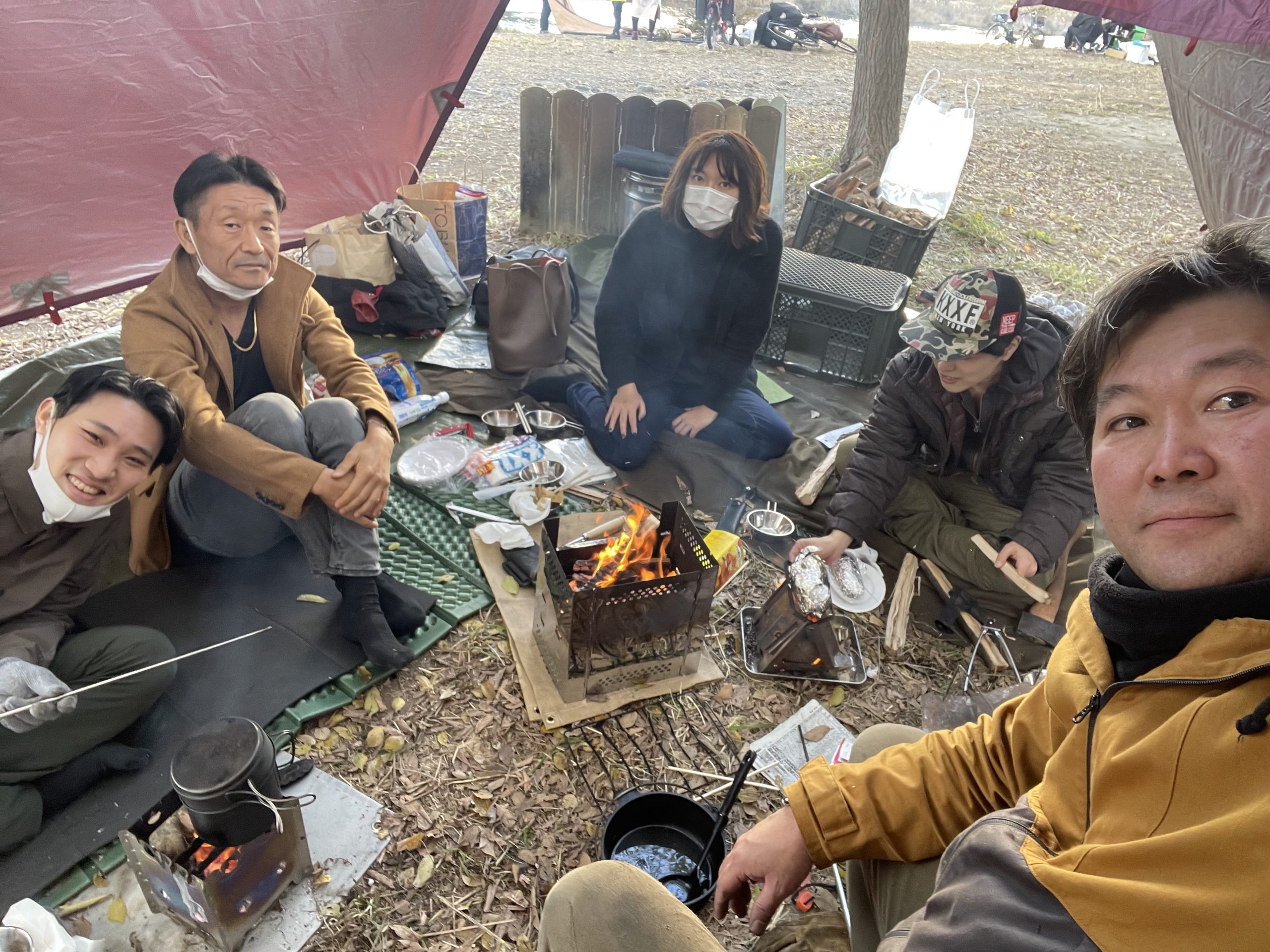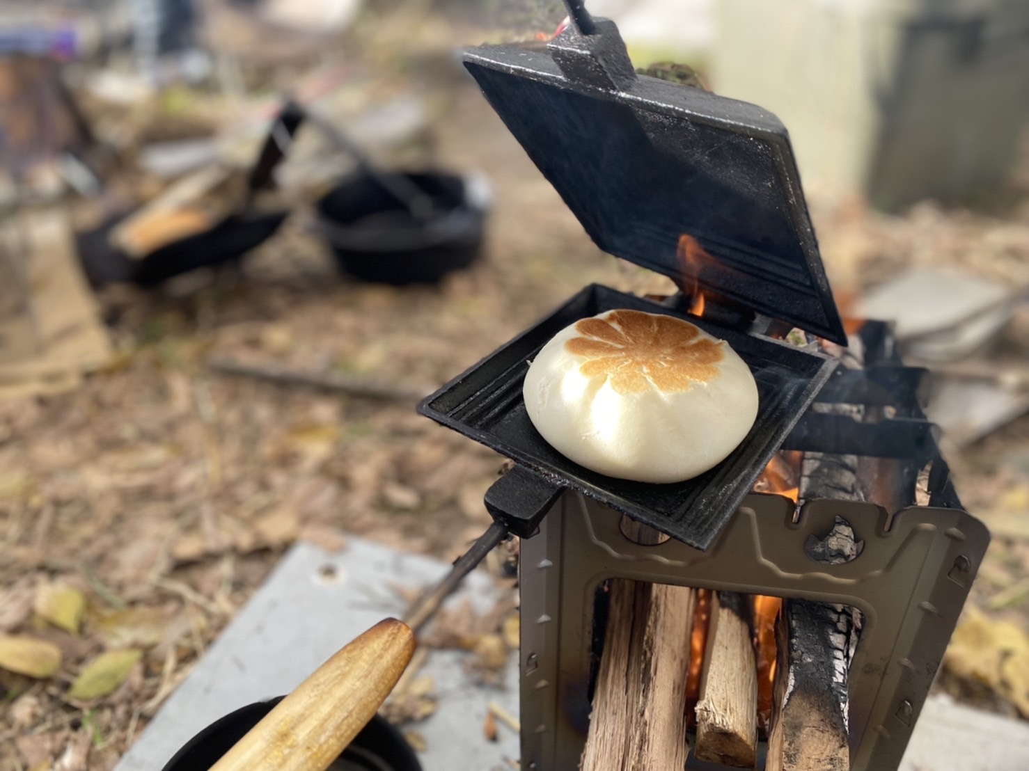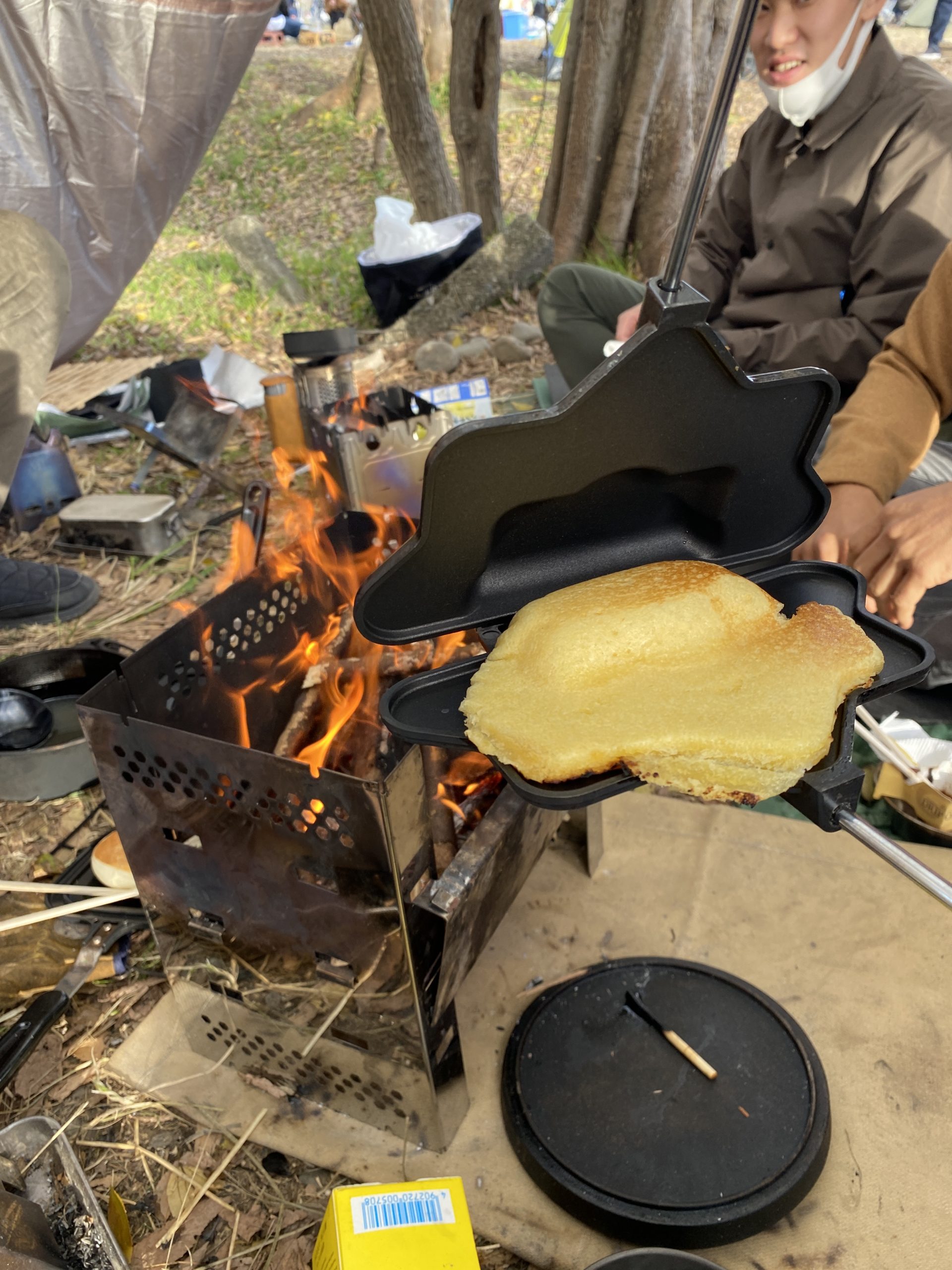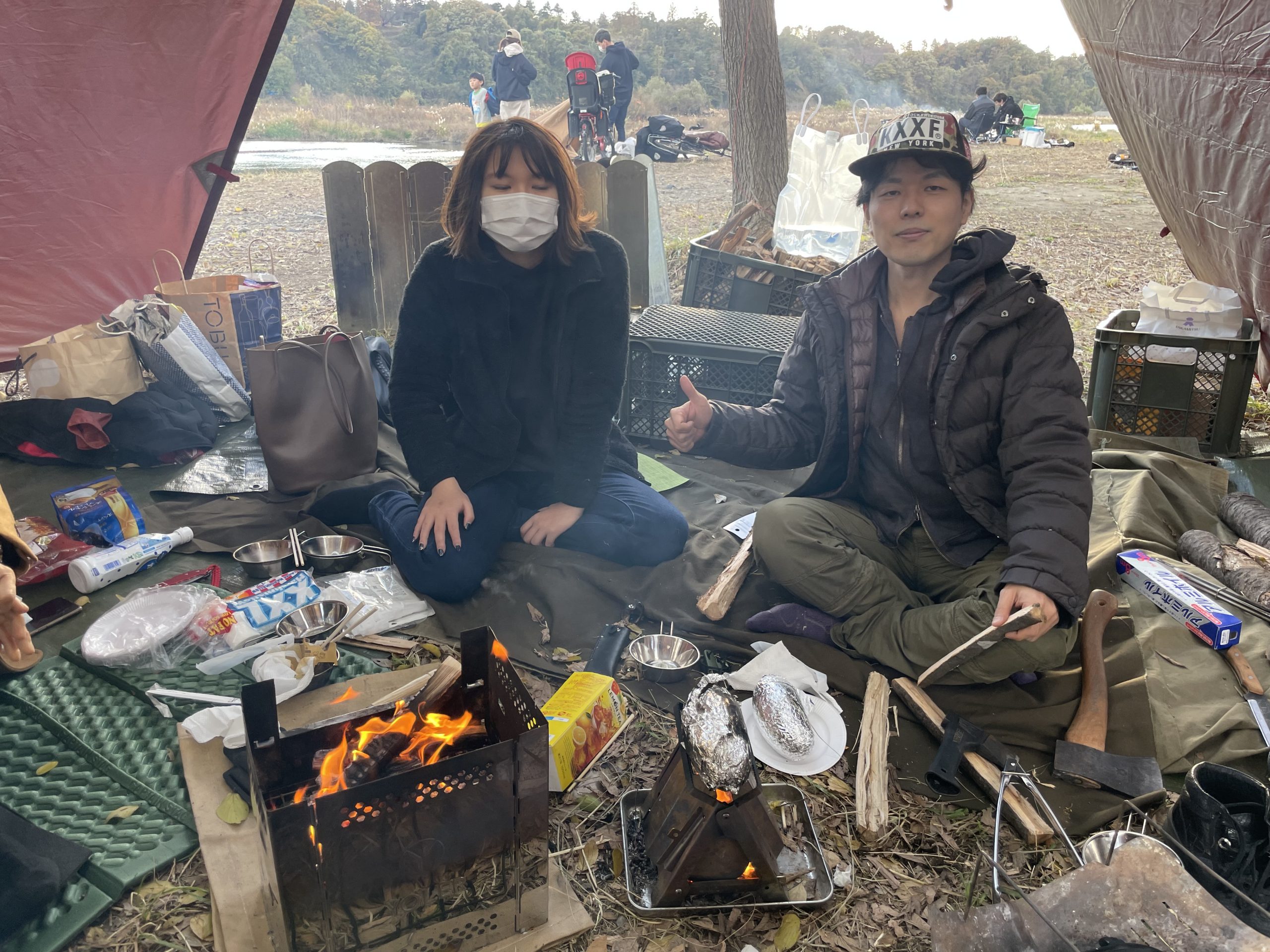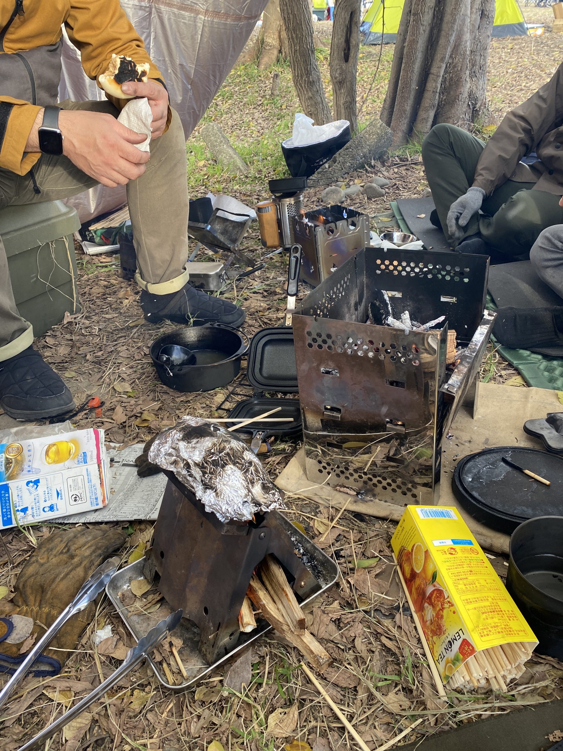 多摩川の河川敷にある無料のバーベキュー場が会場でしたが、河川敷はとても風が強く焚火には向かないのですがタープで囲いを作り何とか風を防ぐことが出来ました。焚火会では風に負けず焼き芋やホットサンドで作った肉まんなどキャンプ飯と焚火を楽しみました。