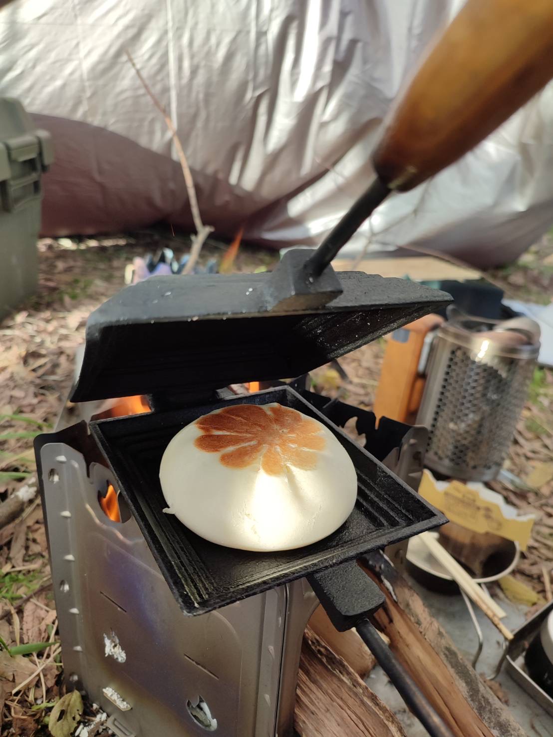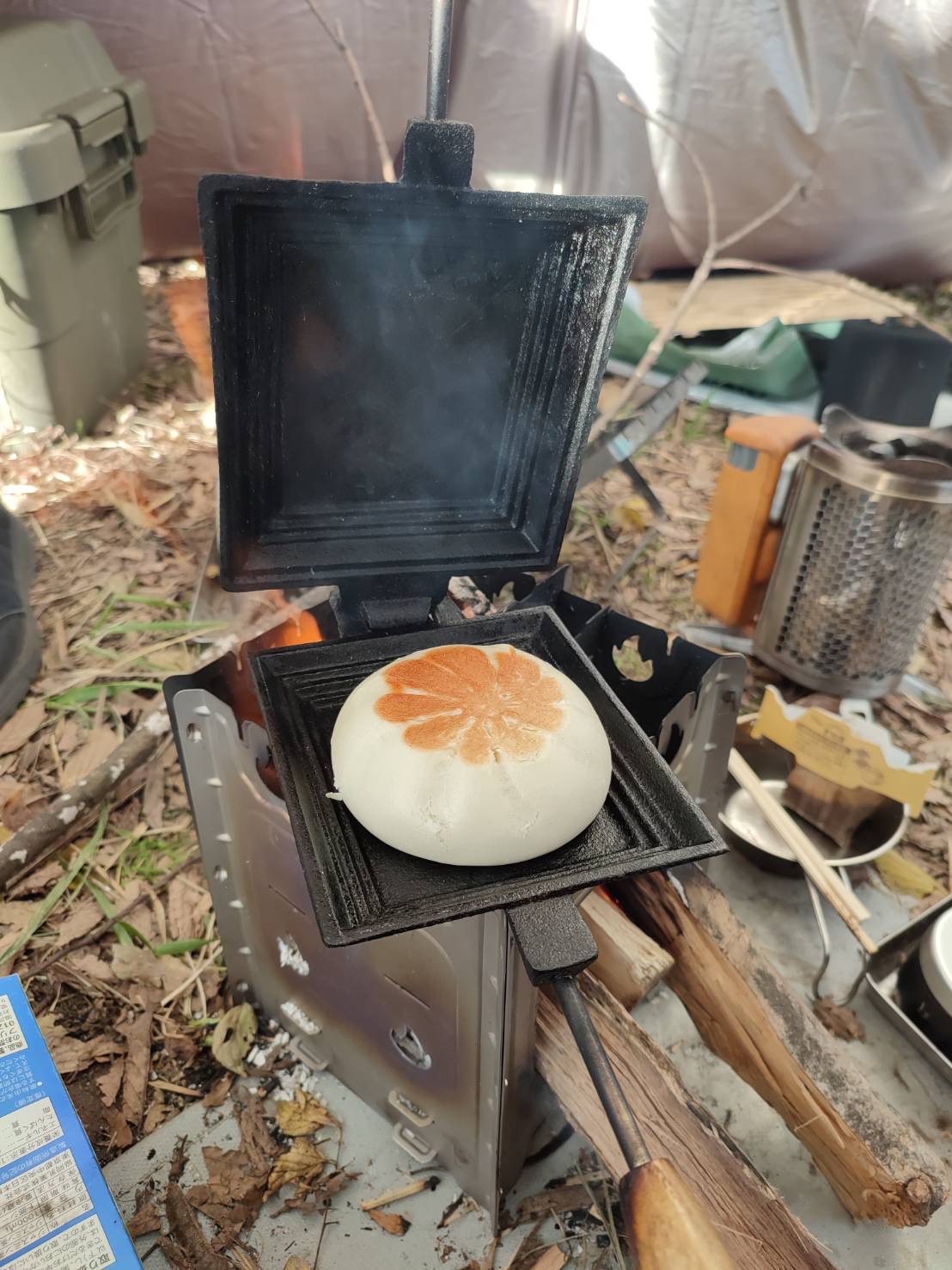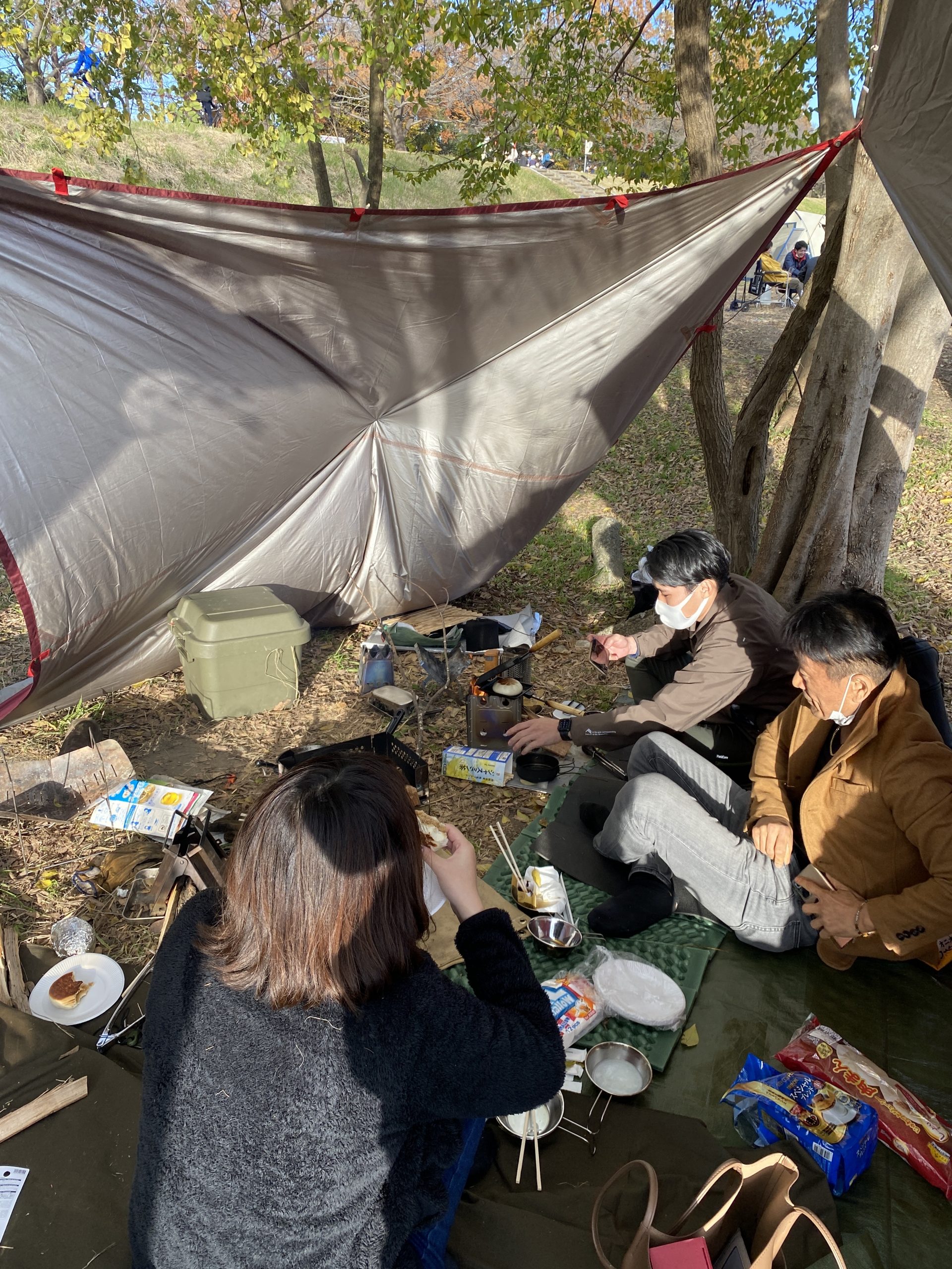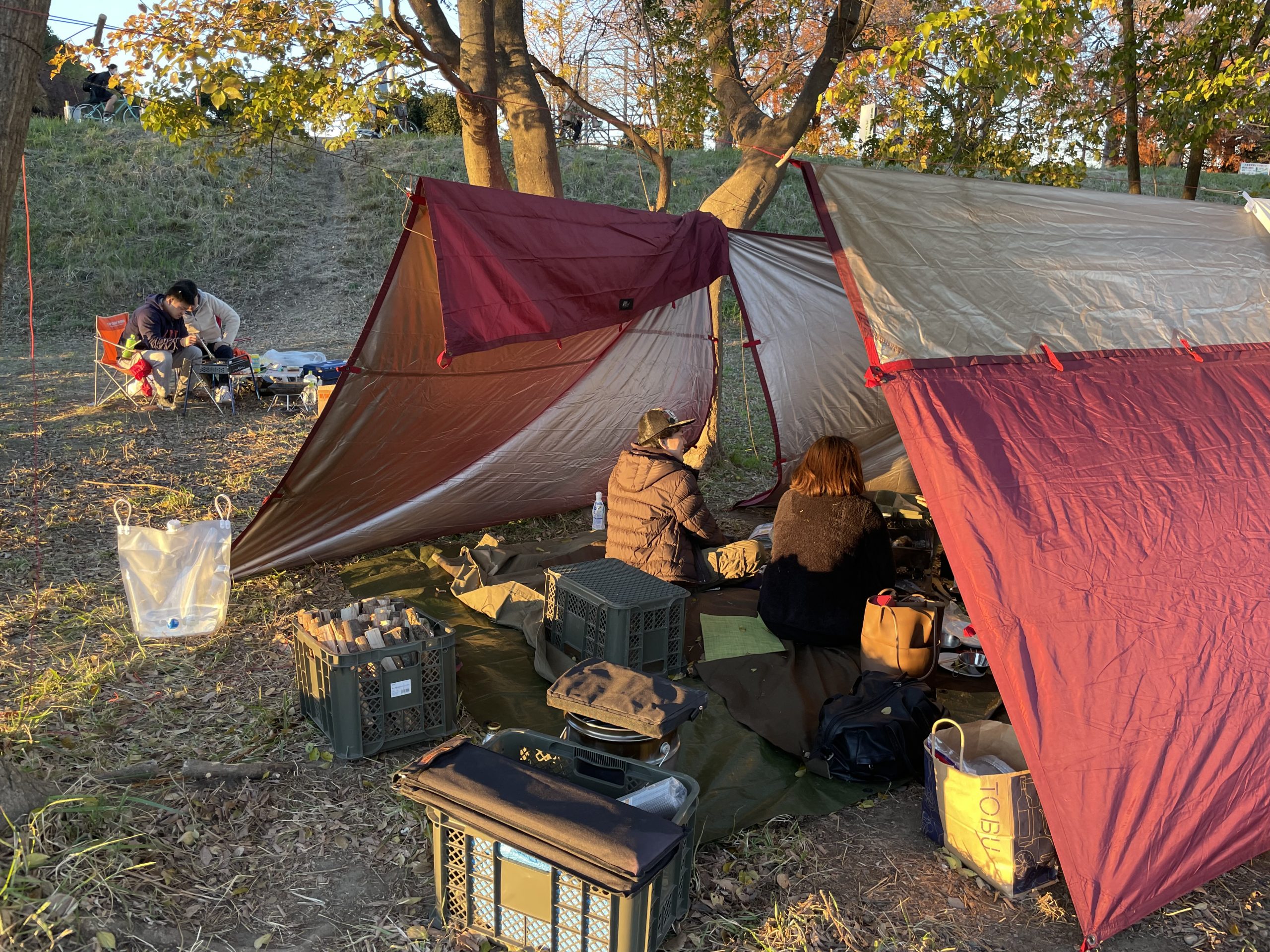 多摩川の河川敷にある無料のバーベキュー場が会場でしたが、河川敷はとても風が強く焚火には向かないのですがタープで囲いを作り何とか風を防ぐことが出来ました。焚火会では風に負けず焼き芋やホットサンドで作った肉まんなどキャンプ飯と焚火を楽しみました。