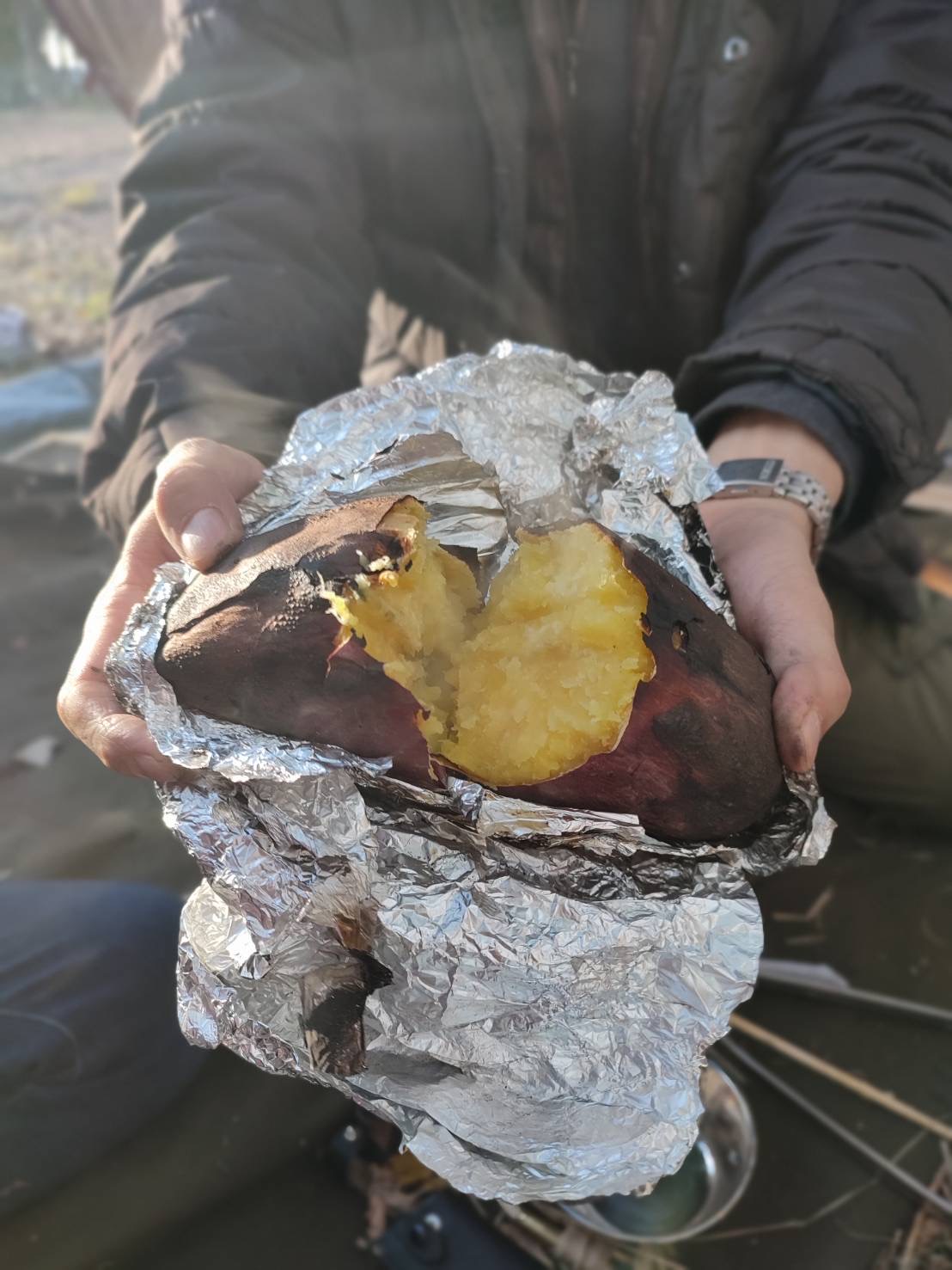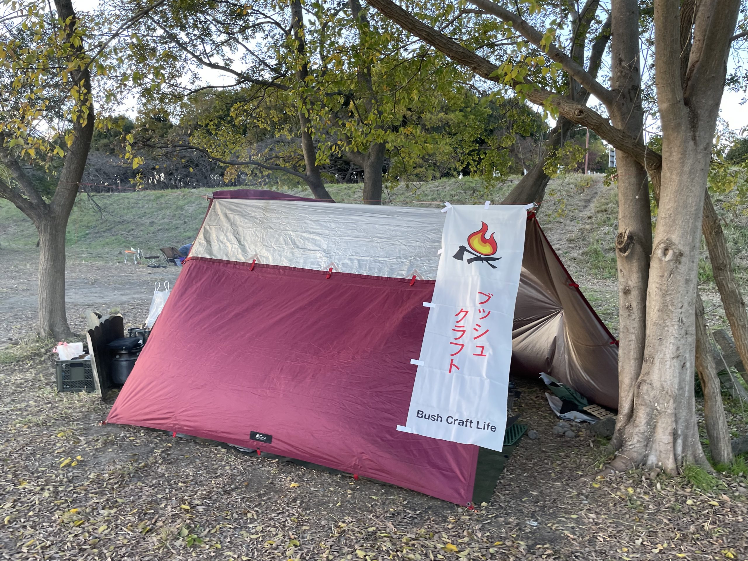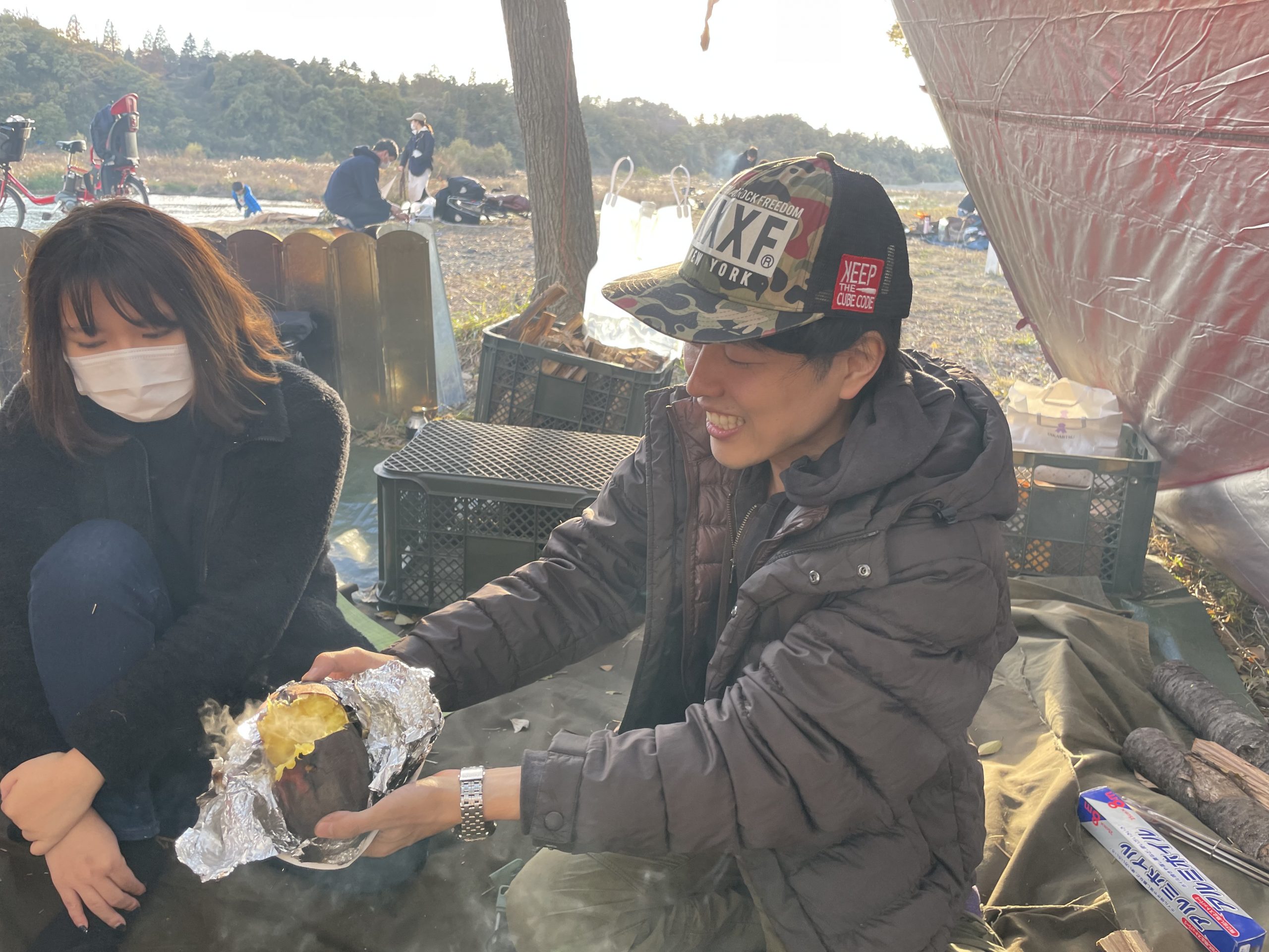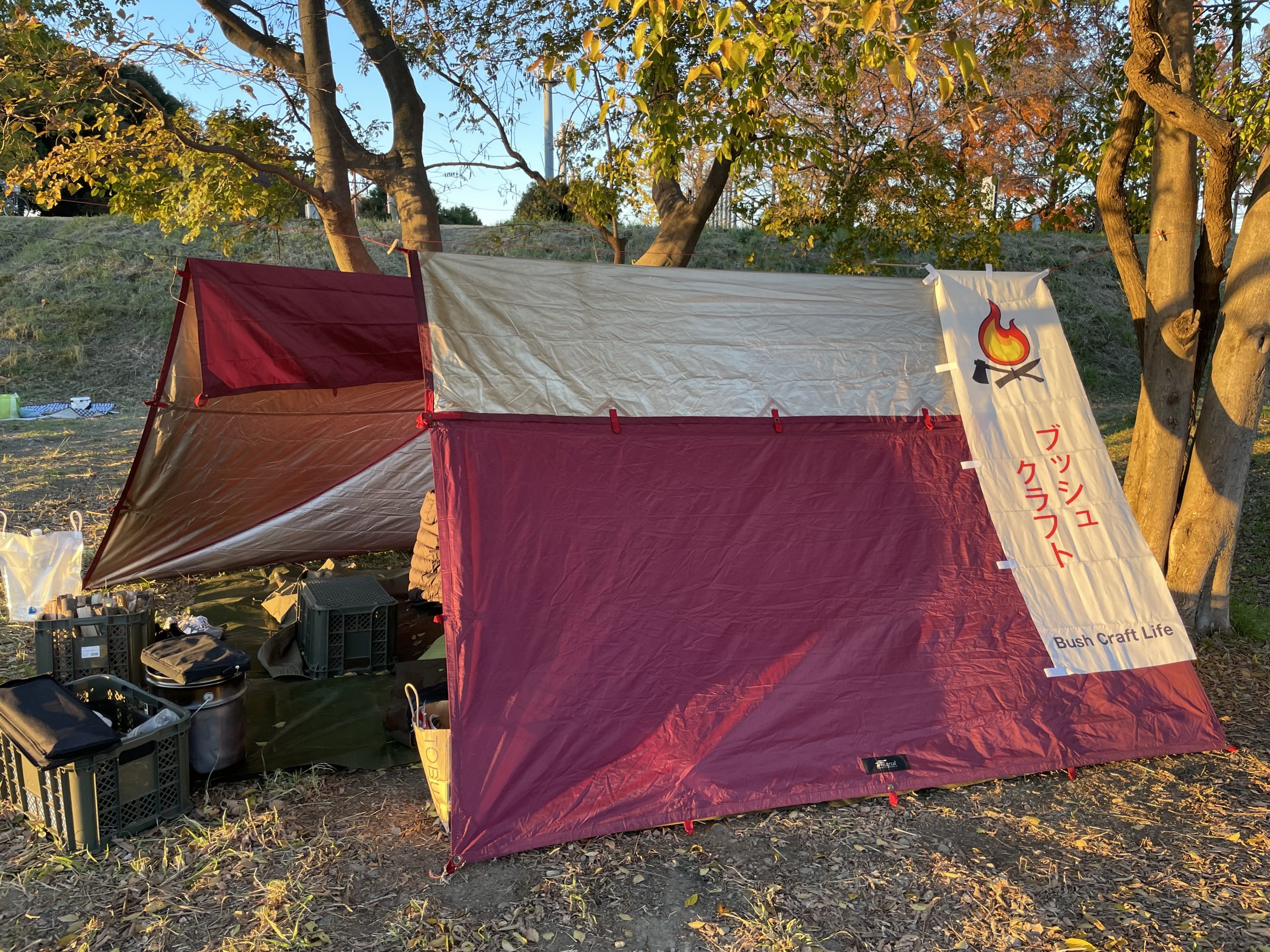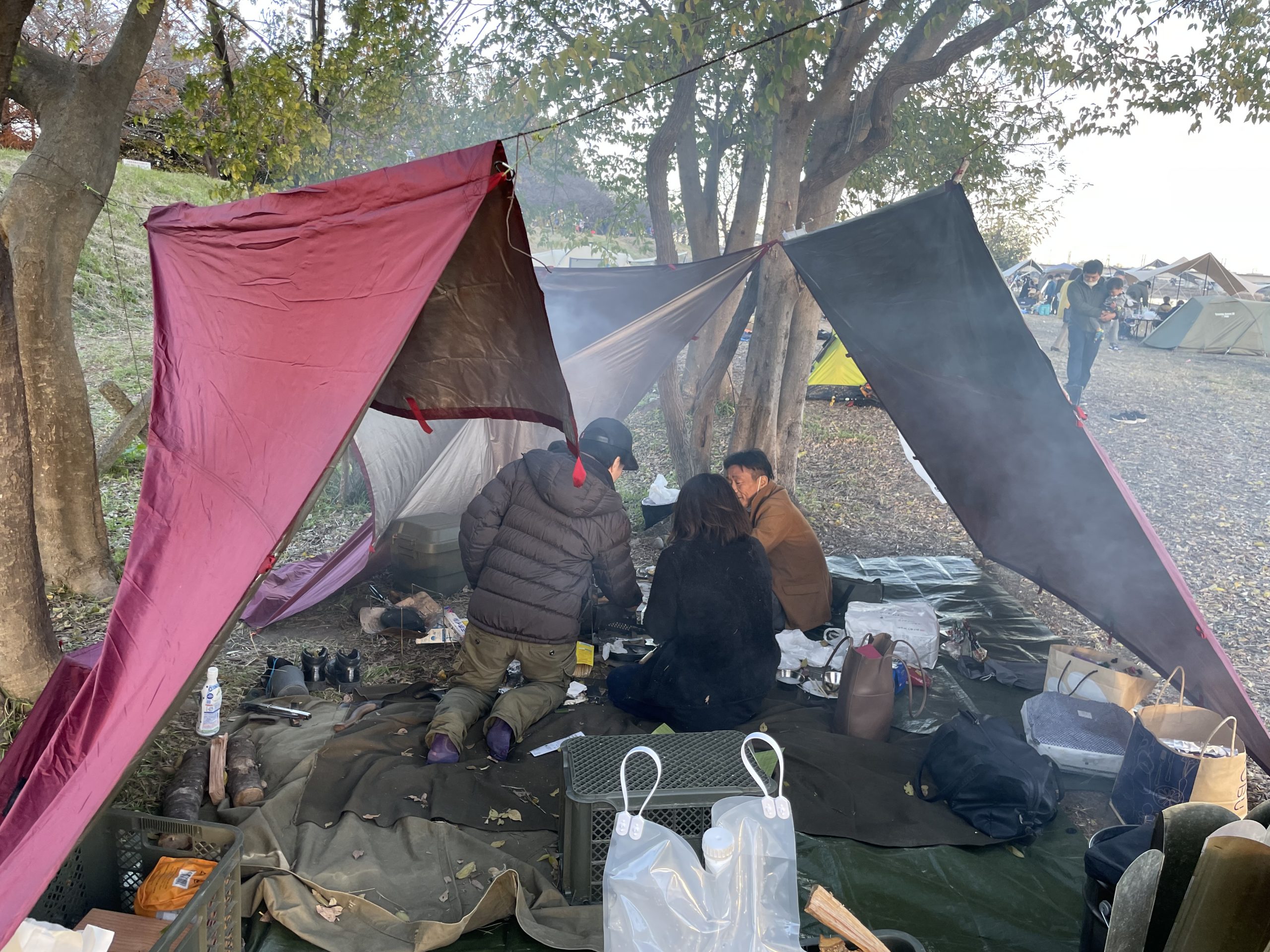 多摩川の河川敷にある無料のバーベキュー場が会場でしたが、河川敷はとても風が強く焚火には向かないのですがタープで囲いを作り何とか風を防ぐことが出来ました。焚火会では風に負けず焼き芋やホットサンドで作った肉まんなどキャンプ飯と焚火を楽しみました。