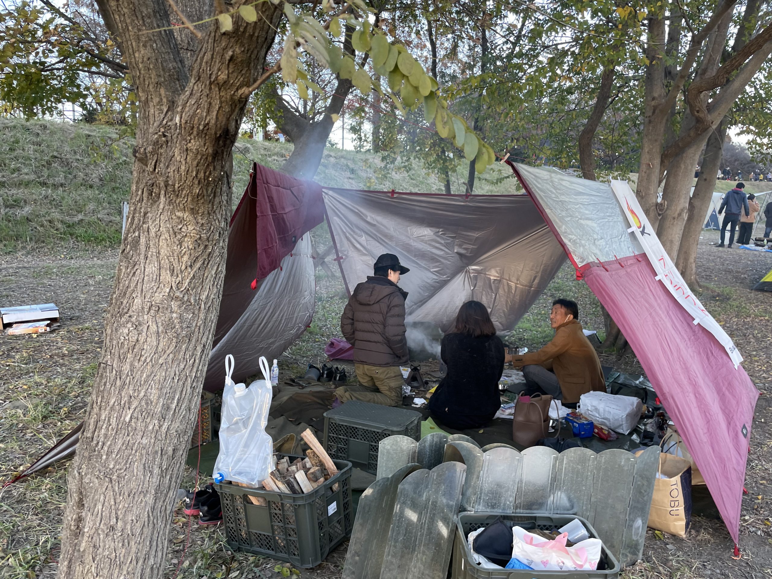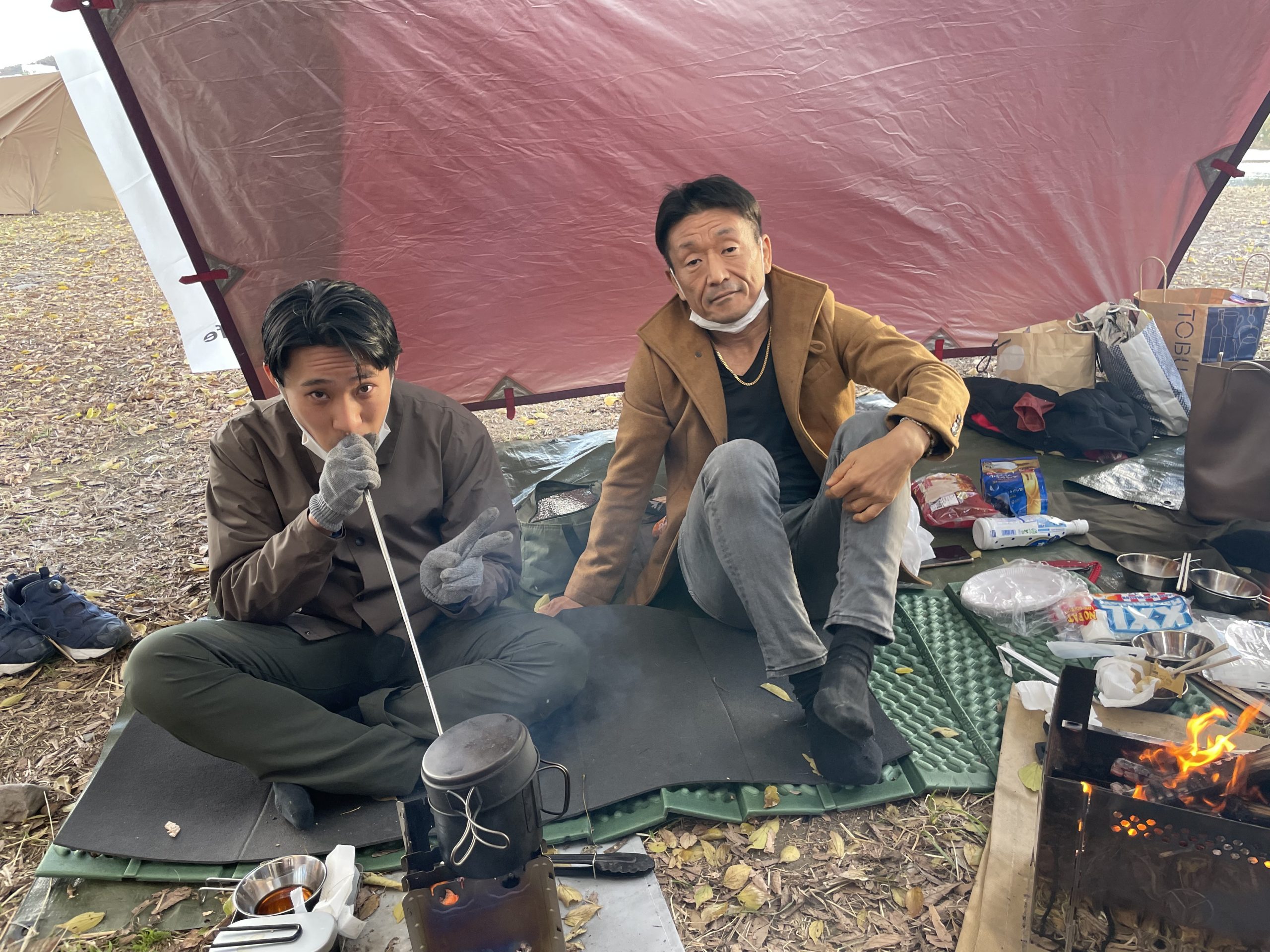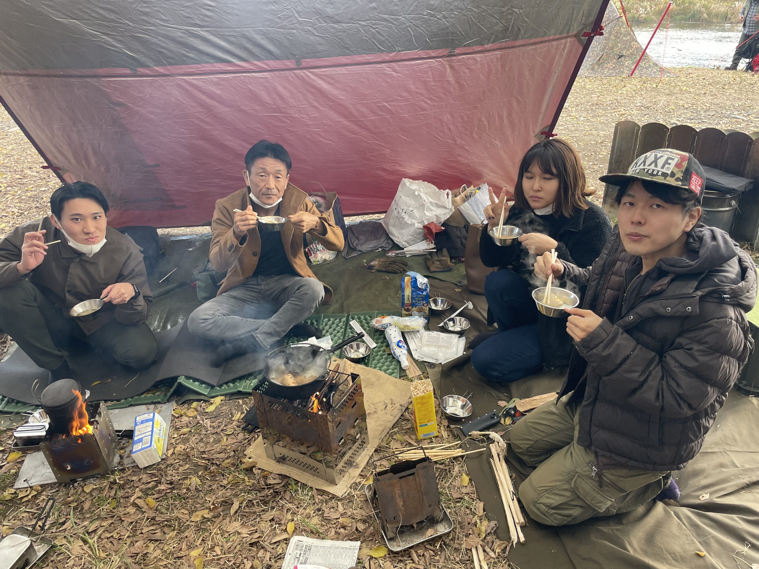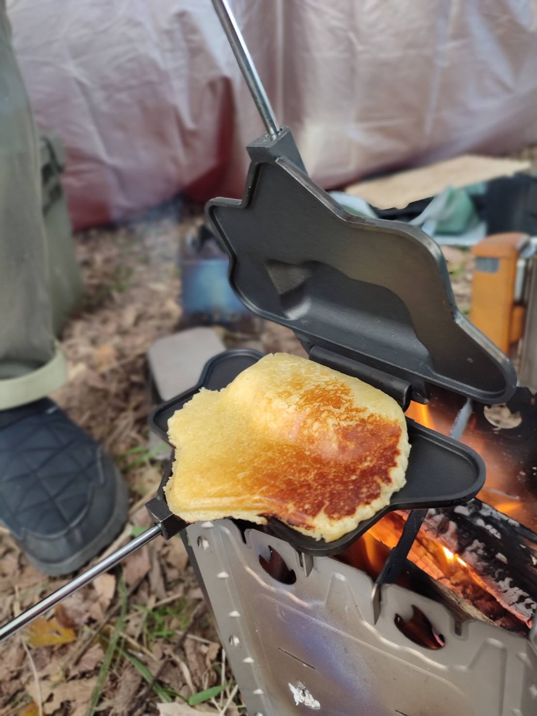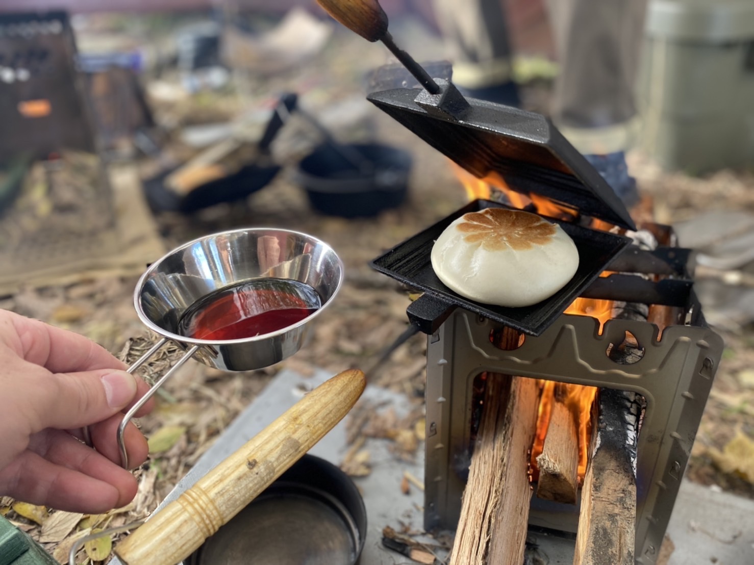 多摩川の河川敷にある無料のバーベキュー場が会場でしたが、河川敷はとても風が強く焚火には向かないのですがタープで囲いを作り何とか風を防ぐことが出来ました。焚火会では風に負けず焼き芋やホットサンドで作った肉まんなどキャンプ飯と焚火を楽しみました。